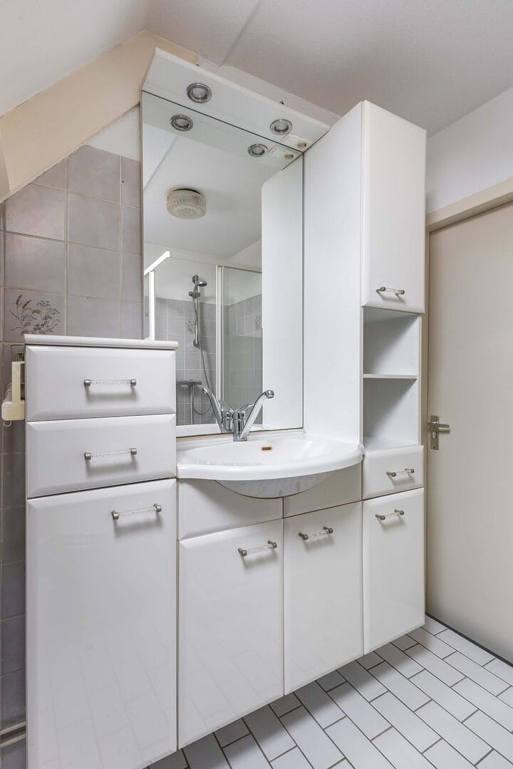 Vanaf de vaste trap op de begane grond betreedt u de overloop van de eerste verdieping, die toegang biedt tot drie ruime en lichte slaapkamers, elk met een prettige maat en volop daglicht dankzij de grote raampartijen. De badkamer is functioneel en voorzien van een wastafelmeubel, een douche en een tweede toilet, waardoor het een praktische ruimte is voor het hele gezin.