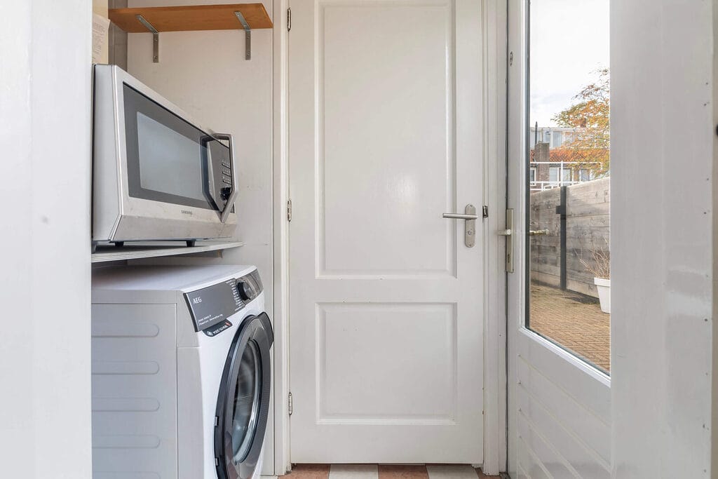 Via de fraaie voortuin betreed je de woning en kom je in de lichte entree, waar direct de karakteristieke trap met stijlvolle overzettredes in het oog springt. Vanuit het entree heb je toegang tot de meterkast, de trap naar de verdieping en de sfeervolle woonkamer. Deze woonkamer ademt warmte en karakter dankzij de nette houten vloeren, het strak gestuukte plafond met inbouwspots en de grote raampartijen die zorgen voor een overvloed aan daglicht. Via de openslaande deuren bereik je de diepe, op het westen gelegen achtertuin, waar je tot in de late avonduren van de zon kunt genieten. Achterin de tuin bevindt zich een ruime berging (voorzien van elektra en water) met achterom, ideaal voor fietsen en tuingereedschap. De open keuken (2015) vormt het hart van de woonkamer en is voorzien van een praktisch spoeleiland en moderne inbouwapparatuur, waaronder een vaatwasser, 4-pits gasstel, koel-vriescombinatie en oven. Aansluitend bevindt zich een bijkeuken met de opstelplaats voor de CV-ketel (Remeha Avanta HR, 2015) en de wasmachineaansluiting. Aan de achterzijde van de bijkeuken is bovendien een separaat toilet gesitueerd.