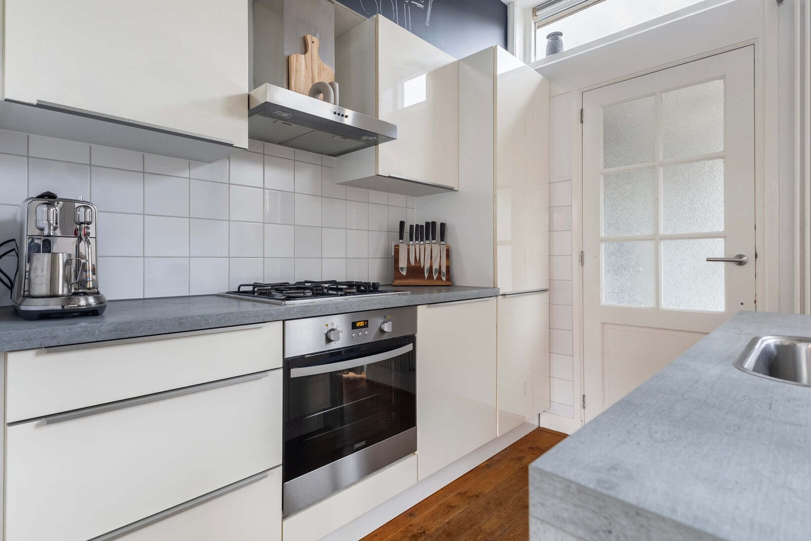 Via de fraaie voortuin betreed je de woning en kom je in de lichte entree, waar direct de karakteristieke trap met stijlvolle overzettredes in het oog springt. Vanuit het entree heb je toegang tot de meterkast, de trap naar de verdieping en de sfeervolle woonkamer. Deze woonkamer ademt warmte en karakter dankzij de nette houten vloeren, het strak gestuukte plafond met inbouwspots en de grote raampartijen die zorgen voor een overvloed aan daglicht. Via de openslaande deuren bereik je de diepe, op het westen gelegen achtertuin, waar je tot in de late avonduren van de zon kunt genieten. Achterin de tuin bevindt zich een ruime berging (voorzien van elektra en water) met achterom, ideaal voor fietsen en tuingereedschap. De open keuken (2015) vormt het hart van de woonkamer en is voorzien van een praktisch spoeleiland en moderne inbouwapparatuur, waaronder een vaatwasser, 4-pits gasstel, koel-vriescombinatie en oven. Aansluitend bevindt zich een bijkeuken met de opstelplaats voor de CV-ketel (Remeha Avanta HR, 2015) en de wasmachineaansluiting. Aan de achterzijde van de bijkeuken is bovendien een separaat toilet gesitueerd.