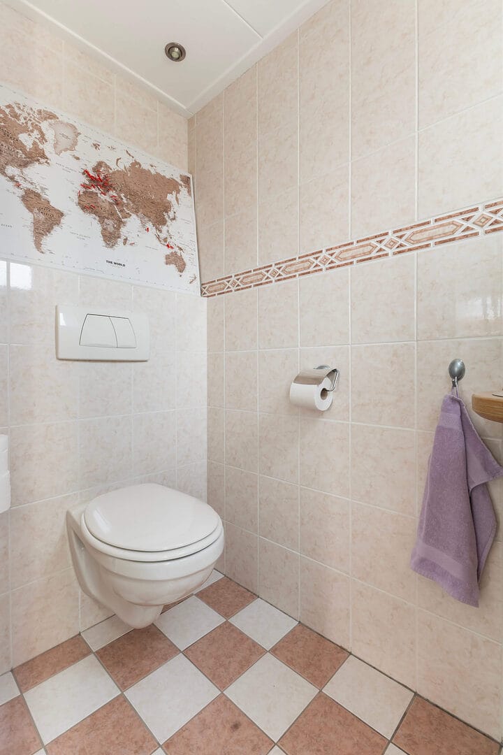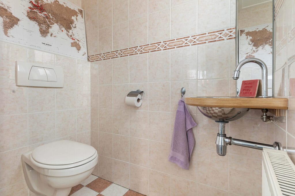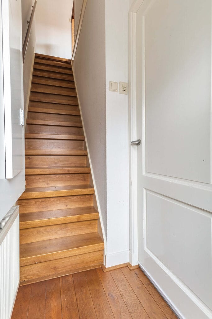 Via de prachtige trap bereiken we de overloop van de eerste verdieping, die toegang biedt tot twee royale slaapkamers en de badkamer. Beide slaapkamers zijn voorzien van een nette laminaatvloer, bieden voldoende ruimte voor vaste (kleding)kasten en profiteren van veel raampartijen waardoor er een fijne hoeveelheid daglicht binnenvalt. De slaapkamer aan de voorzijde geeft via een vlizotrap toegang tot een ruime bergzolder, ideaal voor extra opslag. De badkamer is compleet uitgerust met een douche met stort- en handdouche, een wastafel en een tweede toilet, waardoor functionaliteit en comfort uitstekend zijn gecombineerd.