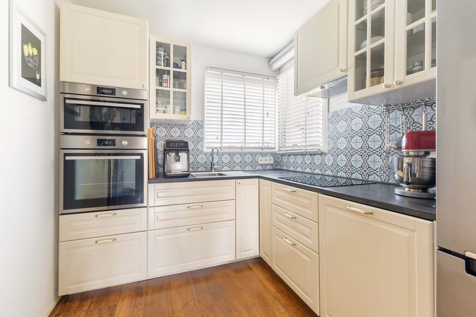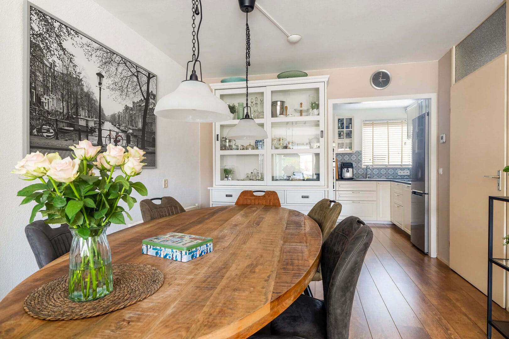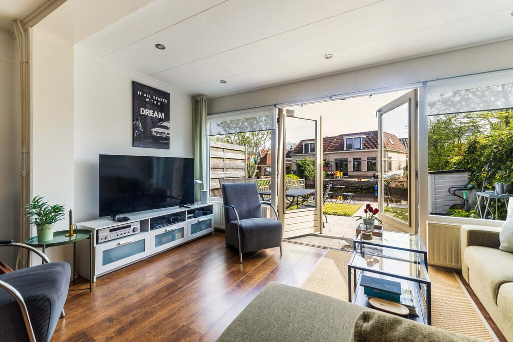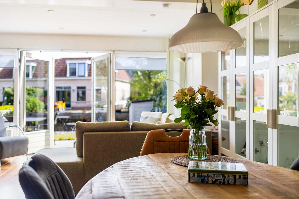 Wat direct opvalt is de royale leefruimte: dankzij een grote aanbouw aan de achterzijde is er een bijzonder ruime en lichte woonkamer ontstaan, met openslaande deuren naar de zonnige tuin op het zuidoosten. Hier lopen binnen en buiten moeiteloos in elkaar over. De keuken (2019/2020) aan de voorzijde is compleet uitgevoerd met diverse inbouwapparatuur, waaronder een inductiekookplaat, oven, magnetron en vaatwasser, en biedt volop werk- en bergruimte.